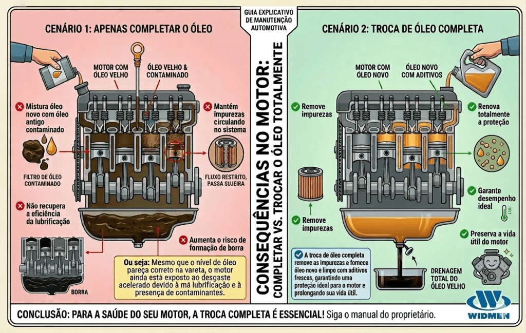 Completar o óleo resolve apenas o nível, mas não resolve a qualidade do lubrificante.